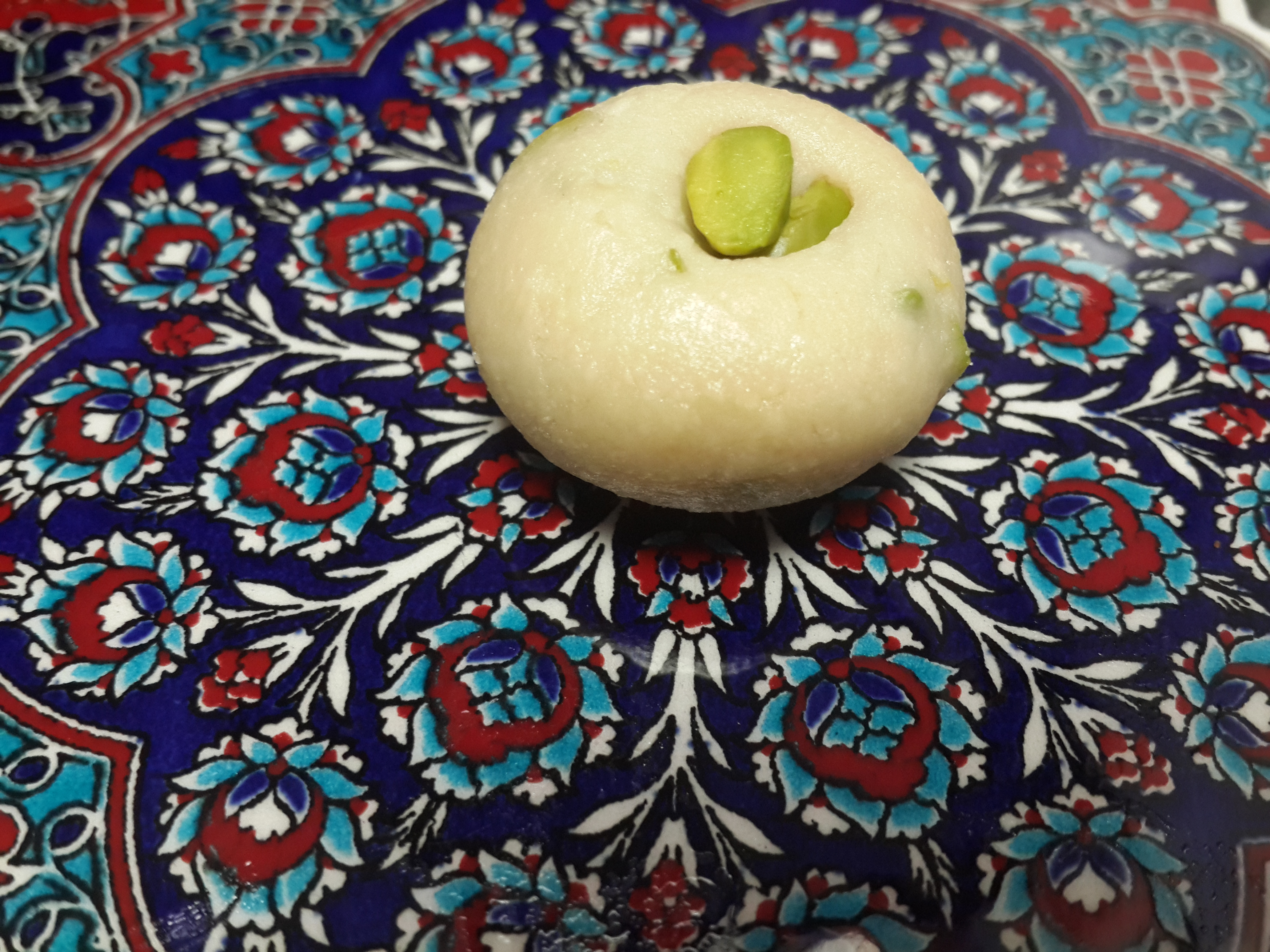 Result this time, the difference just adding 2-3 tsp of milk to the mixture so that it does not dry out. Also I did grease my palms well and hence you see the sheen on the peda this time around. Win!