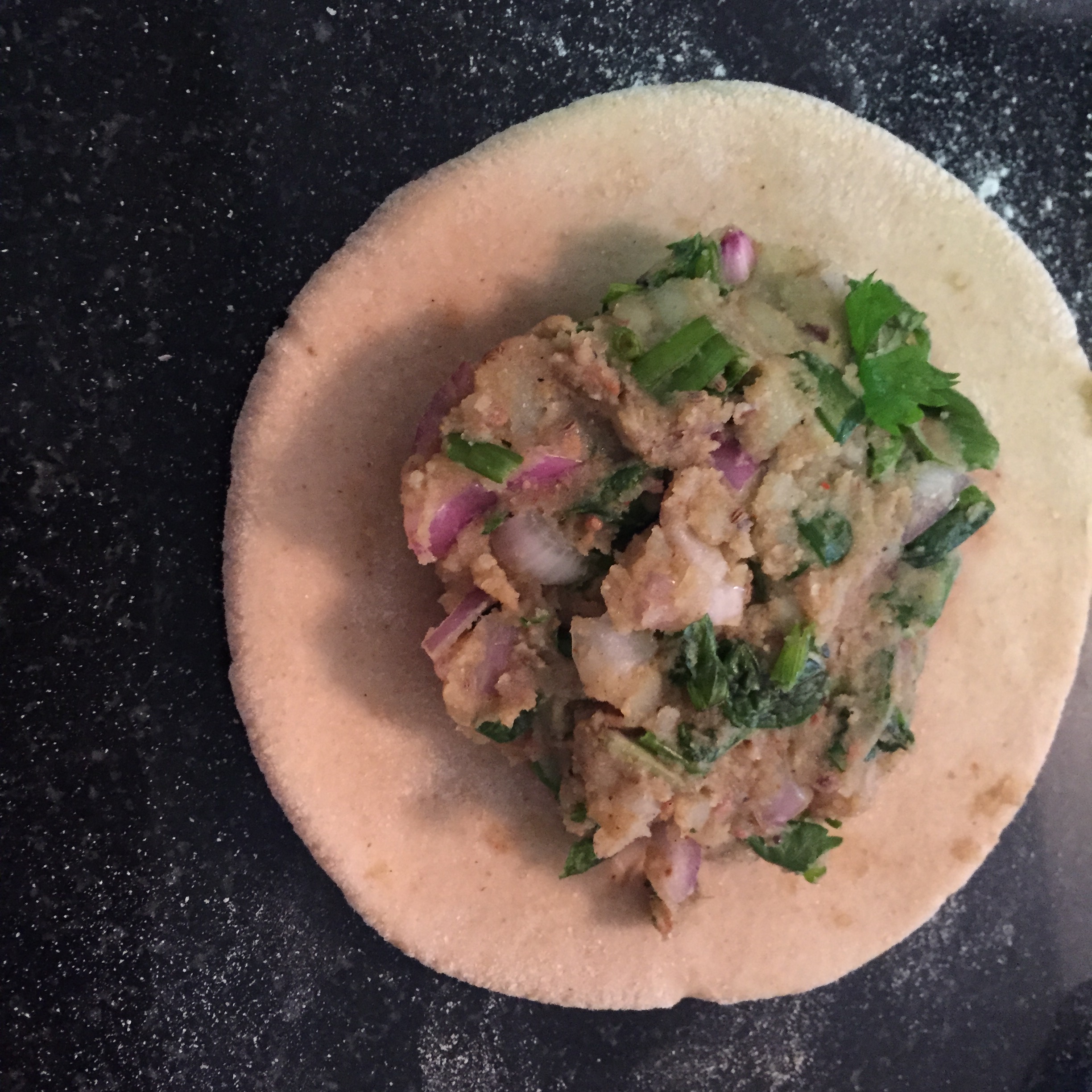 Add the potato stuffing in the centre, seal the dough ball and flatten it out.