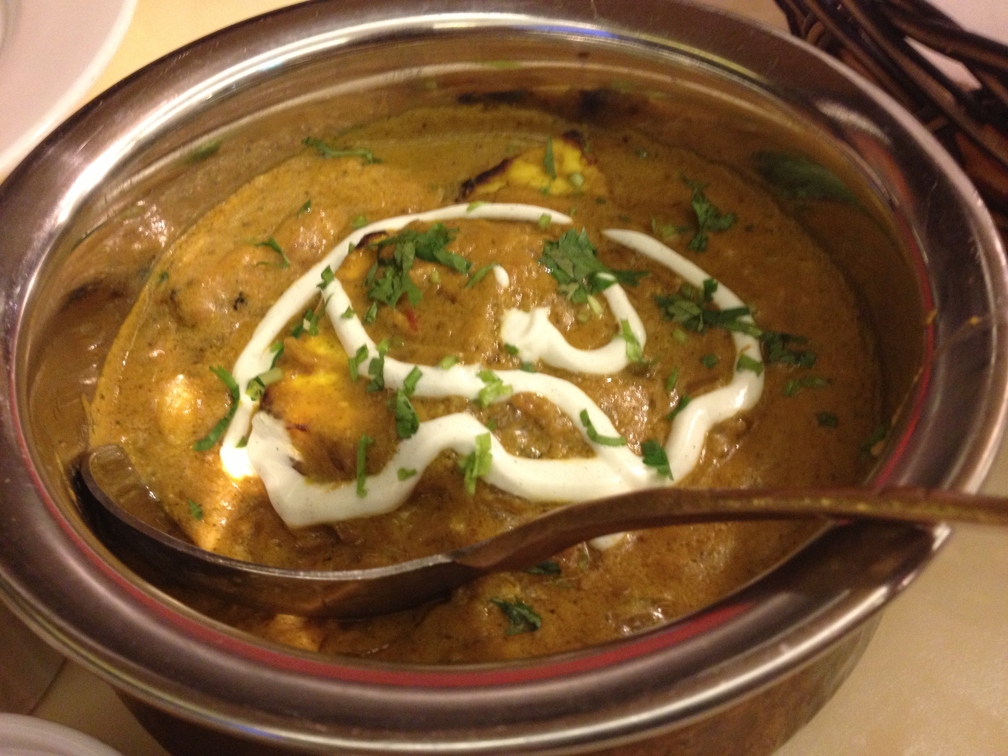 Handi Paneer was creamy, the onion tomato gravy not overpowering the softness of paneer. I would have liked the cream to be thinned before the garnish though. It felt too heavy for the otherwise balanced flavors. I just scrapped the cream off the top and had the gravy underneath. It also had diced capscicum.